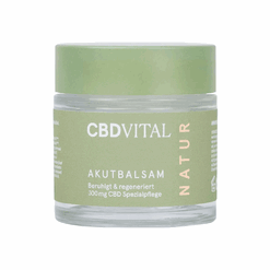 Das CBD Akutbalsam von CBD VITAL ist als Akutpflege für gereizte, schuppige und gerötete Haut geeignet. Laut Herstellerangaben wird die gestörte Barrierefunktion der Haut gegenüber Allergenen, Reizen, Bakterien oder chemischen Stoffen durch diese reichhaltige Kombination aus CBD und altbewährten Pflanzenextrakten wieder hergestellt. Das Akutbalsam stelle eine effektive, natürliche Alternative zu Kortison bei Hautrötungen und Juckreiz oder bei zu Neurodermitis oder Psorias neigender Haut dar.